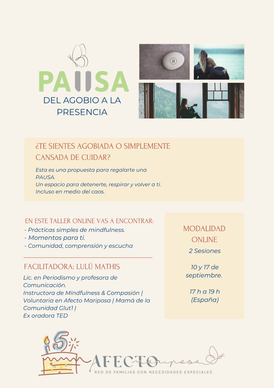 Afecto Mariposa te trae un nuevo taller On line de 2 sesiones. Una propuesta sencilla, un espacio donde detenerte, respirar y volver a ti. Incluso en medio del caos.